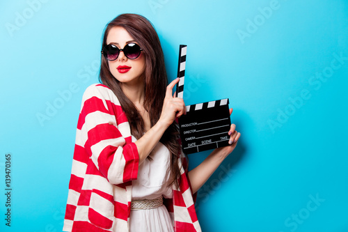 © Masson, Fototapeta premium beautiful young woman with cinema clapper standing in front of wonderful blue background