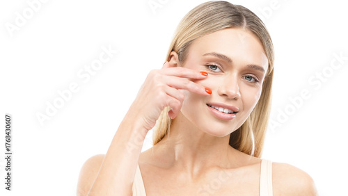 Fototapeta premium Beautiful young woman with clean fresh skin gently touching her face,...