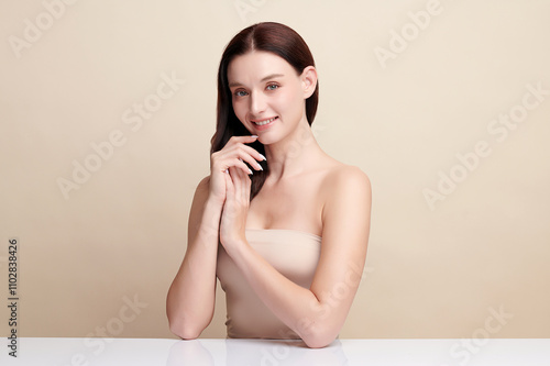 Obraz premium Beautiful young woman with clean fresh skin on beige background, Face care, Facial treatment, Cosmetology, beauty and spa, women portrait.