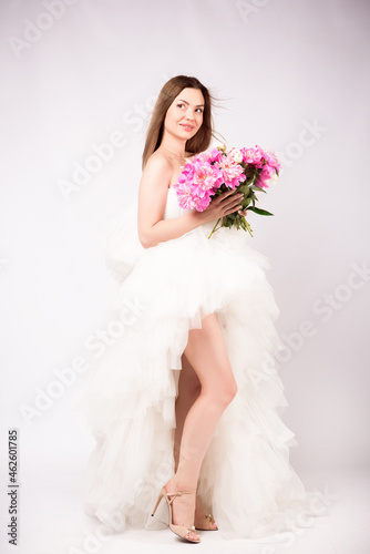 Fototapeta premium Beautiful young woman with delicate peony flower.