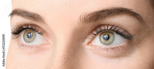 © Pixel-Shot, Obraz premium Beautiful young woman with eyelash extensions on white background, closeup