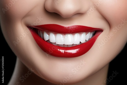 Obraz premium Beautiful young woman with healthy white teeth red lips on black background.