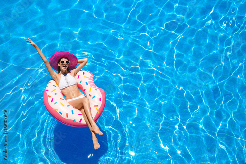 © Africa Studio, Naklejka premium Beautiful young woman with inflatable donut in blue swimming pool