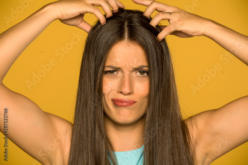 © vladimirfloyd, Naklejka premium Beautiful young woman with itchy scalp on yellow background