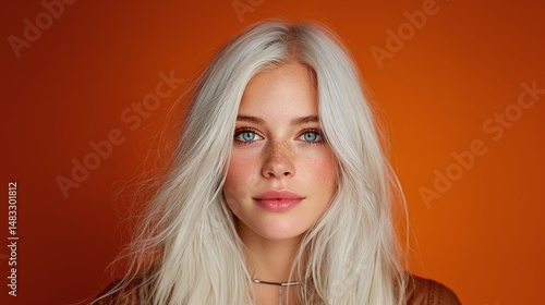 © Oleksandr, Fototapeta premium Beautiful young woman with long white hair on orange background. Portrait of pretty caucasian female with perfect skin, makeup, blue eyes. Beauty, skincare, wellness concept.