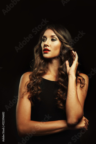 Fototapeta premium Beautiful young woman with make up and long wavy hair on black background
