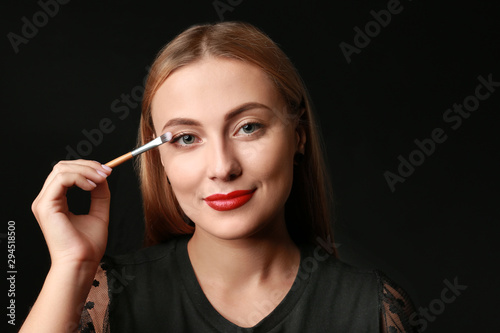 Obraz premium Beautiful young woman with makeup brush on dark background