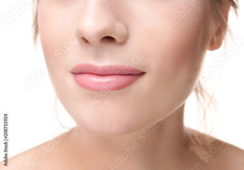 Obraz premium Beautiful young woman with silky skin on white background, closeup