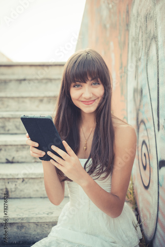 © Eugenio Marongiu, Obraz premium beautiful young woman with white dress using tablet