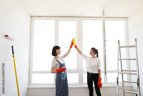 Fototapeta premium Beautiful young women in rubber gloves with detergent and rag washing windows together giving high five. Attractive caucasian girls making house cleaning after repair.