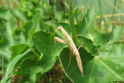 Naklejka premium Beautiful young yellow mantis on green leaves in the garden, closeup