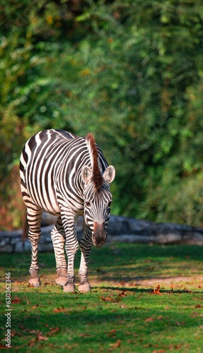 © Dominick Montano/Wirestock Creators, Fototapeta premium Beautiful zebra standing in a lush grassy field surrounded by tall trees on a sunny day