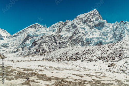 Fototapeta premium Beautifull Khumbu glacier mountains landscape at the Everest Base Camp trek in the Himalaya, Nepal. Himalaya landscape and mountain views.