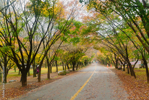 Fototapeta premium beautifully captures a scenic autumn road in Naejangsan, Korea, lined with trees exhibiting vibrant fall foliage, creating a picturesque landscape.