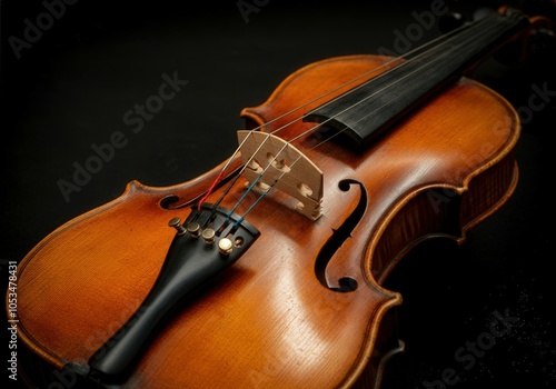 Fototapeta premium Beautifully crafted violin is presented on a dark background, highlighting the instrument's polished wood and intricate details