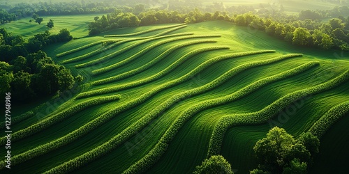 © BYAI, Fototapeta premium Beautifully curved green fields ripple across the landscape under soft morning light at a rural farm