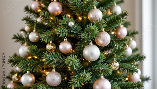 Fototapeta premium Beautifully decorated Christmas tree adorned with pink and silver ornaments,...