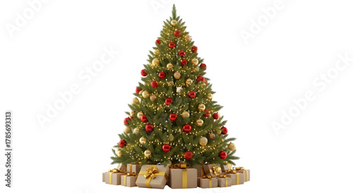 Naklejka premium Beautifully decorated christmas tree with presents underneath isolated on...