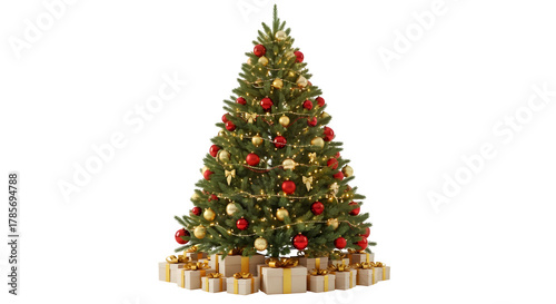 Fototapeta premium Beautifully decorated christmas tree with presents underneath isolated on...