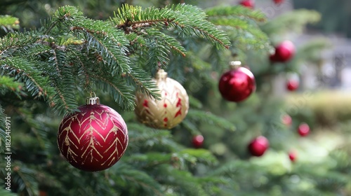Fototapeta premium Beautifully Decorated Christmas Tree with Red and Gold Ornaments Glimmering Amongst Fresh Evergreen Branches, Creating a Festive Holiday Atmosphere