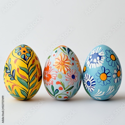 © CleanPhotos, Fototapeta premium Beautifully decorated Easter eggs featuring intricate floral and folk art patterns in vibrant colors, set against a clean background.