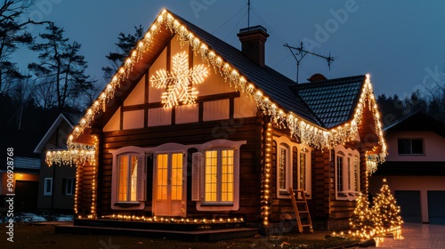 Obraz premium Beautifully decorated house with Christmas lights surrounding the roof and...