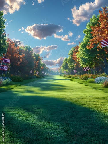 Naklejka premium Beautifully Decorated Patriotic Yard Signs and Banners Celebrating Independence Day Festivities in a Scenic Nature Landscape with Green Grass Trees and Cloudy Sky