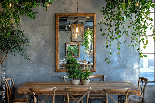 Obraz premium beautifully designed dining space featuring natural wood table surrounded by greenery and elegant decor. warm ambiance is enhanced by mirror reflecting inviting atmosphere