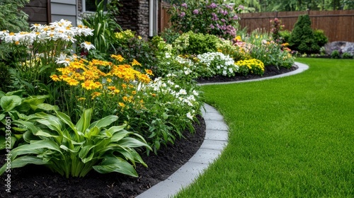 Naklejka premium Beautifully Landscaped Backyard with Vibrant Flowers and Lush Greenery in...