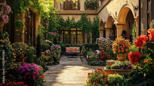 © Kitta Studio, Fototapeta premium Beautifully Landscaped Courtyard with Vibrant Flowers