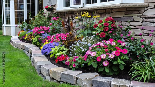 © Sahir Stock, Fototapeta premium Beautifully landscaped front yard with vibrant flower beds and well-maintained stone wall
