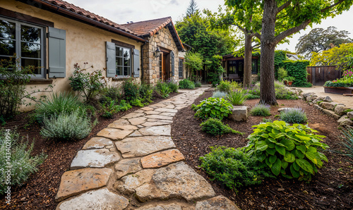 Obraz premium Beautifully landscaped garden pathway with a stone trail and lush greenery in a charming setting