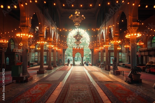 Fototapeta premium Beautifully Lit Interior of a Historic Mosque With Colorful Carpets in...