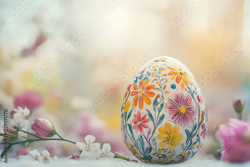 Fototapeta premium Beautifully painted floral egg among spring blossoms