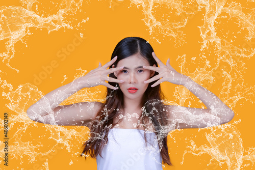 © NITIKAN T., Obraz premium Beauty and healthcare. Portrait of young and beautiful asian woman on yellow background