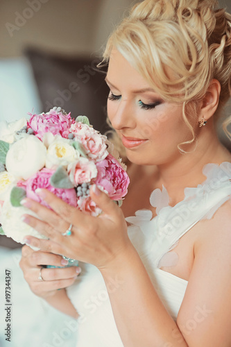 Naklejka premium Beauty bride in bridal gown dress with bouquet and lace veil indoors....