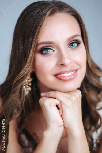 Obraz premium Beauty close-up portrait of bride with luxury make-up and hairstyle, studio indoor photo.