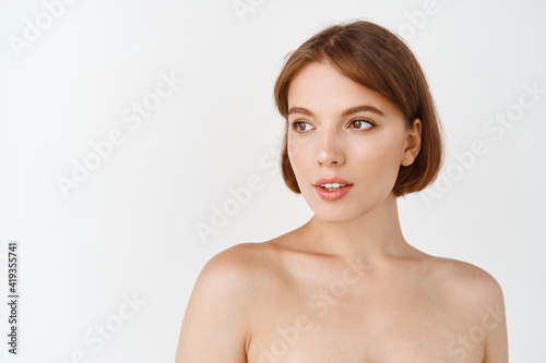 © Cookie Studio, Obraz premium Beauty face. Young beautiful woman with naked shoulders, natural smooth and healthy facial skin, looking away at empty space logo. Girl have perfect face without blemishes, skincare concept
