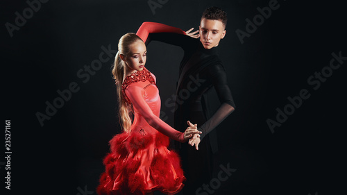 © vitaliismulskyi, Obraz premium Beauty, fashion. Dancing over black background, beautiful couple of ballet dancers