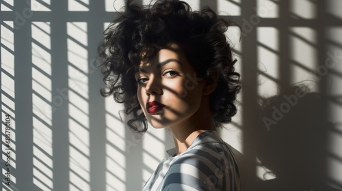 Fototapeta premium beauty fashion woman model portrait with striped black and white light, game of geometry and shadows, fashionable female studio shot