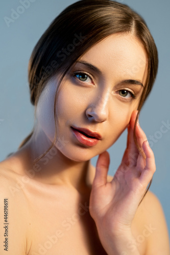Fototapeta premium Beauty freshness. Female dermatology. Skin health. Facial procedure. Portrait of peaceful young attractive woman with gorgeous radiant face isolated on blue.