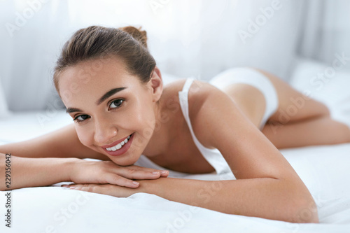 Fototapeta premium Beauty Girl With Beautiful Face And Skin Lying On White Bed
