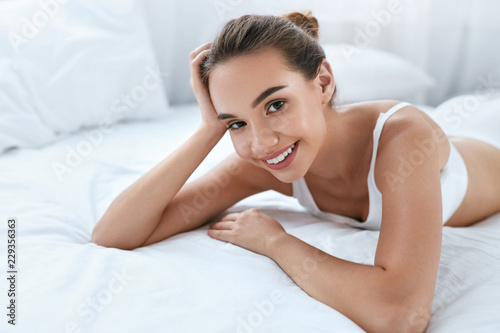 Fototapeta premium Beauty Girl With Beautiful Face And Skin Lying On White Bed