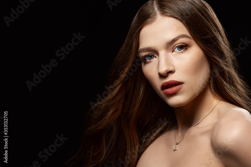 © Victoria Fox, Fototapeta premium Beauty, haircare, skincare, advertising conception: close up studio portrait of beautiful young brunette woman with healthy glow skin, long natural hair, nude colors makeup. Copy, empty space for text