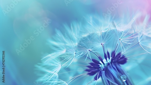 © Generative AI, Obraz premium Beauty in nature Fantasy closeup of dandelion soft morning sunlight after rain pastel colors Peaceful blue green blurred lush foliage dandelion seed Macro spring nature amazing natural : Generative AI