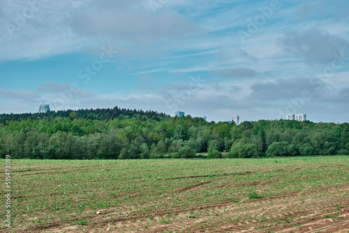 Fototapeta premium Beauty landscape of grass field with forest trees and environment public park...