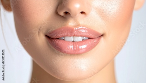 © Ryan Punnington, Fototapeta premium Beauty macro photo of full lips with clear gloss on a neutral background
