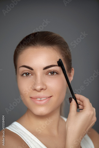 Obraz premium Beauty model. Correcting and contouring eyebrows. Beautiful woman shaping brows with comb.