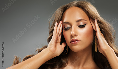 Naklejka premium Beauty Model showing Black Eyeliner Makeup. Permanent Eyeliner Make up. Beautiful Girl Face close up with smooth Skin. Woman Eye and eyelid lifting