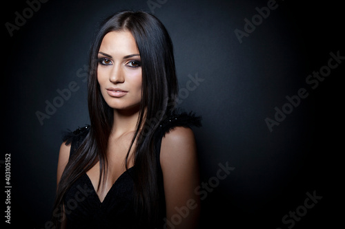 © Dragosh, Fototapeta premium Beauty portrait. Beautiful sensual young woman with long straight hair and bright makeup, over black background.